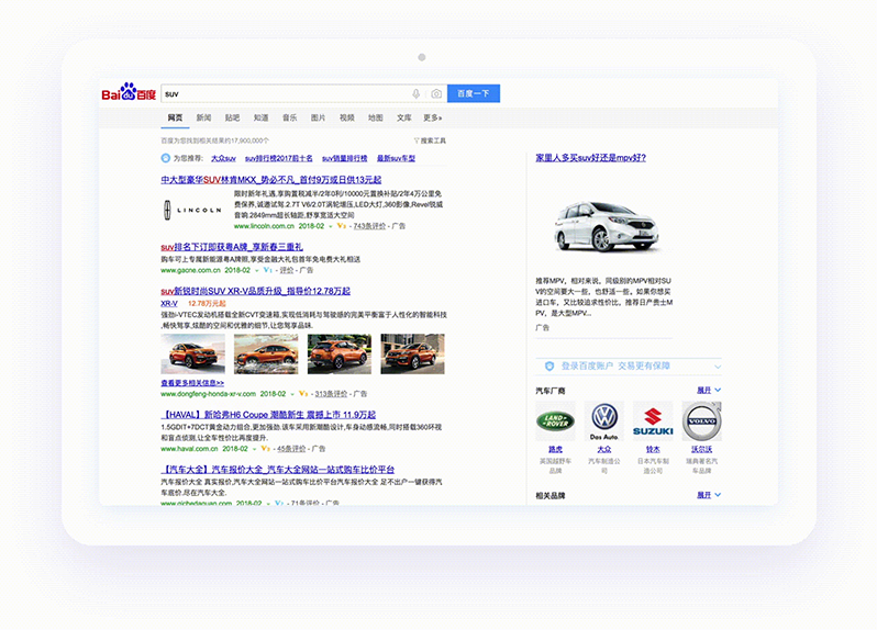 通過關鍵詞精準匹配展現在網頁右側的圖文品牌展示類推廣。產品主要針對客戶的品牌推廣營銷策略, 將 通用詞(如智能手機,三國殺,歐洲自由行,英語培訓等),節日詞(如國慶節,圣誕節) 等關鍵詞占為己有,在網頁搜索結果頁右側將品牌信息前置,樹立和強化企業的品牌影響力。
